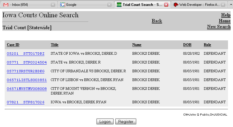 | 3/11/2002 | Iowa | WINDSHIELD/WINDOWS REQUIREMENTS | GUILTY | $35.40 |